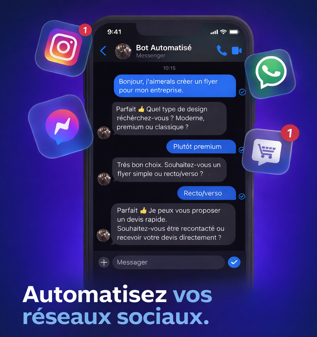 Automatisez vos échanges et transformez vos messages en opportunités. Nous développons des chatbots intelligents pour vos réseaux sociaux (Instagram, Messenger…) capables de répondre instantanément à vos prospects, qualifier vos demandes et générer des leads en continu. Offrez une expérience client fluide, gagnez du temps et augmentez votre chiffre d’affaires grâce à une automatisation sur-mesure, adaptée à votre activité.